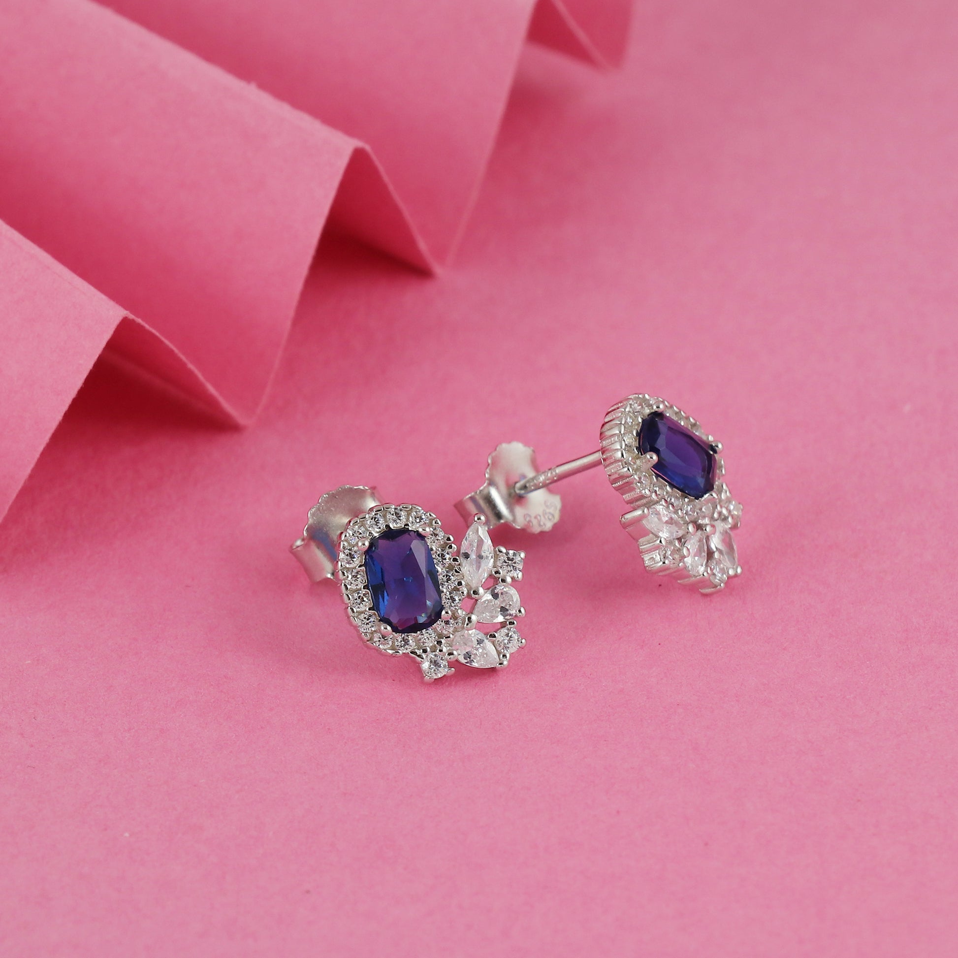 Blue oval CZ stud earrings hallmarked in 925 pure silver in rhodium plating with AA+ Cubic Zirconia stones.