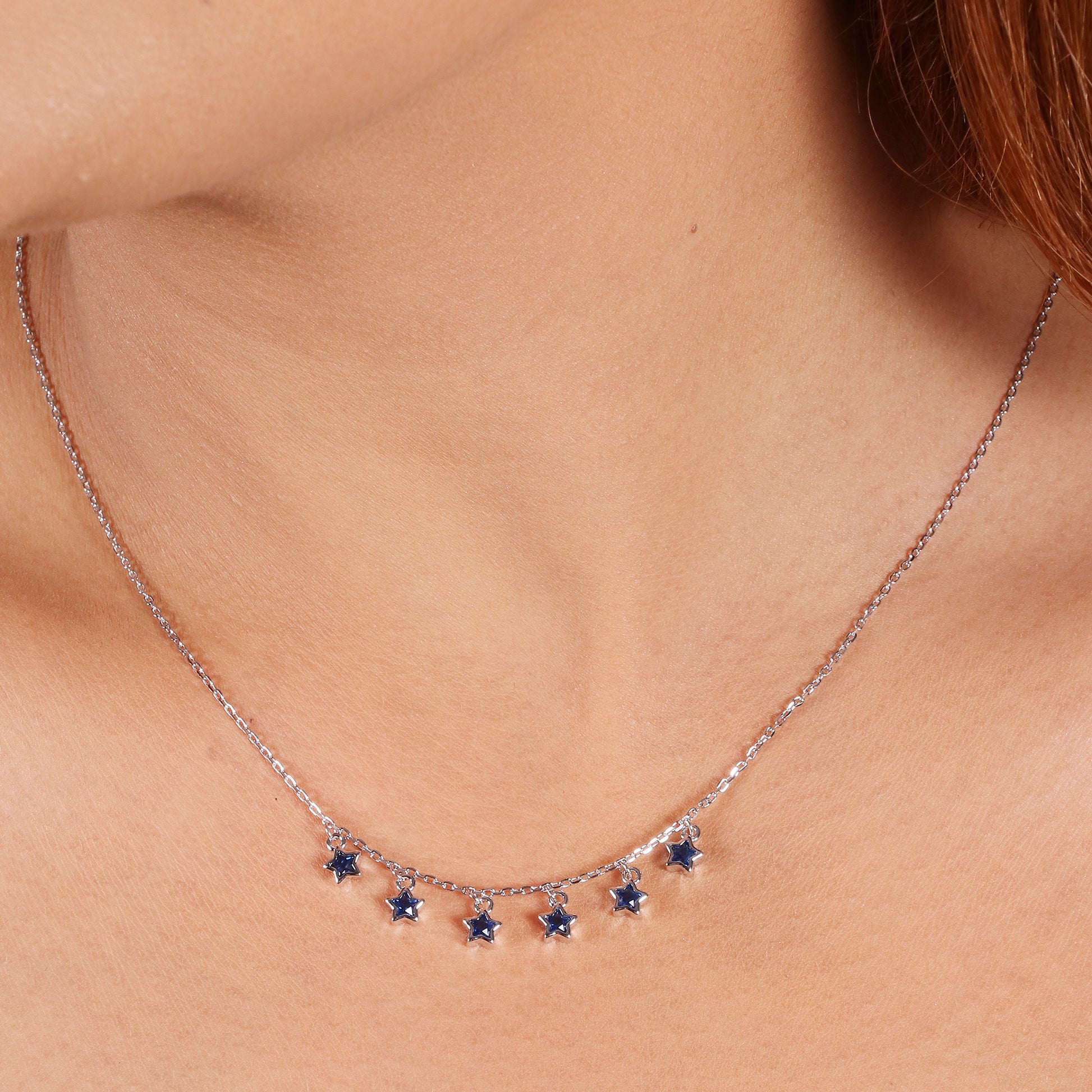 Dainty blue CZ star chain pendent set hallmarked in 925 pure silver in rhodium plating with AA+ Cubic Zirconia stones.