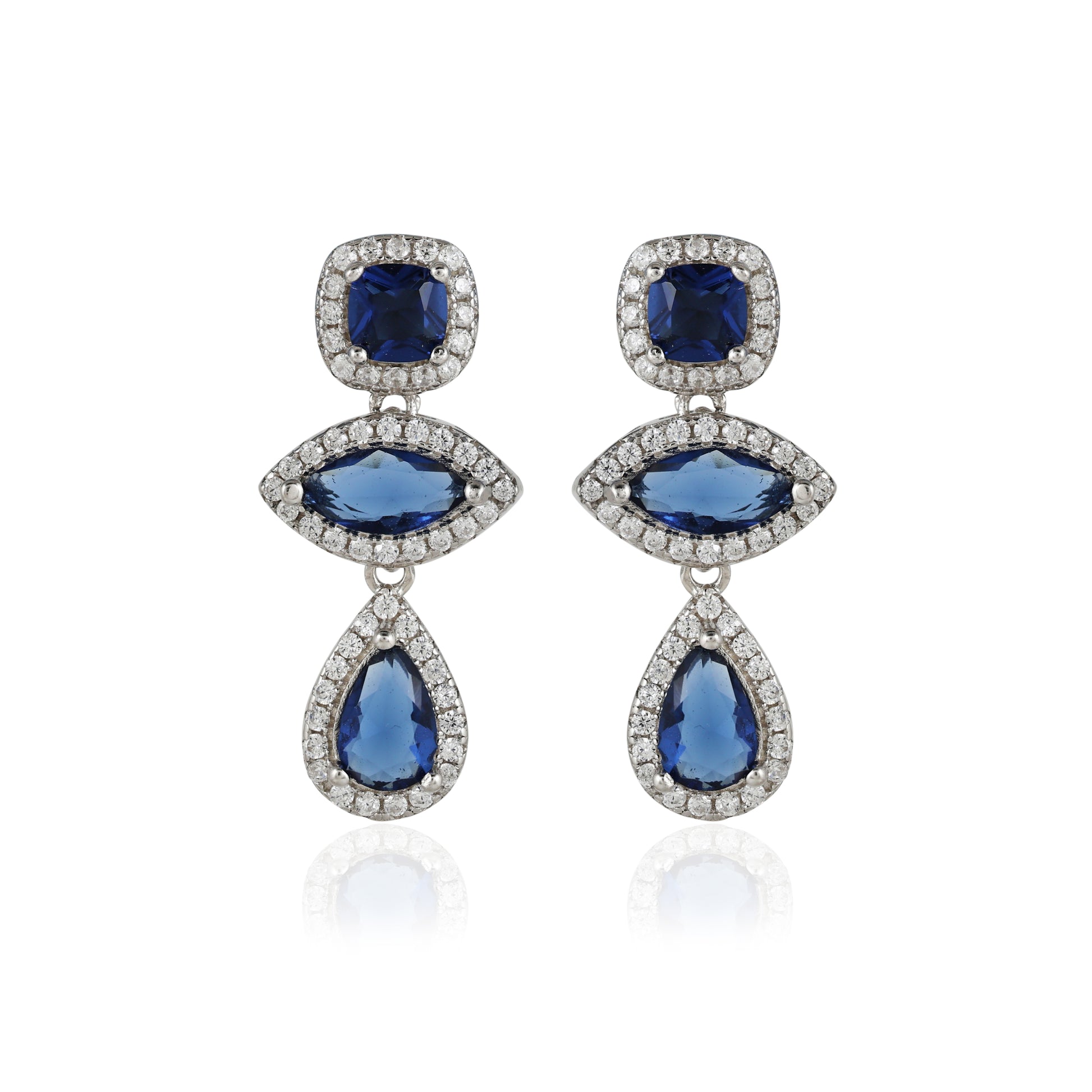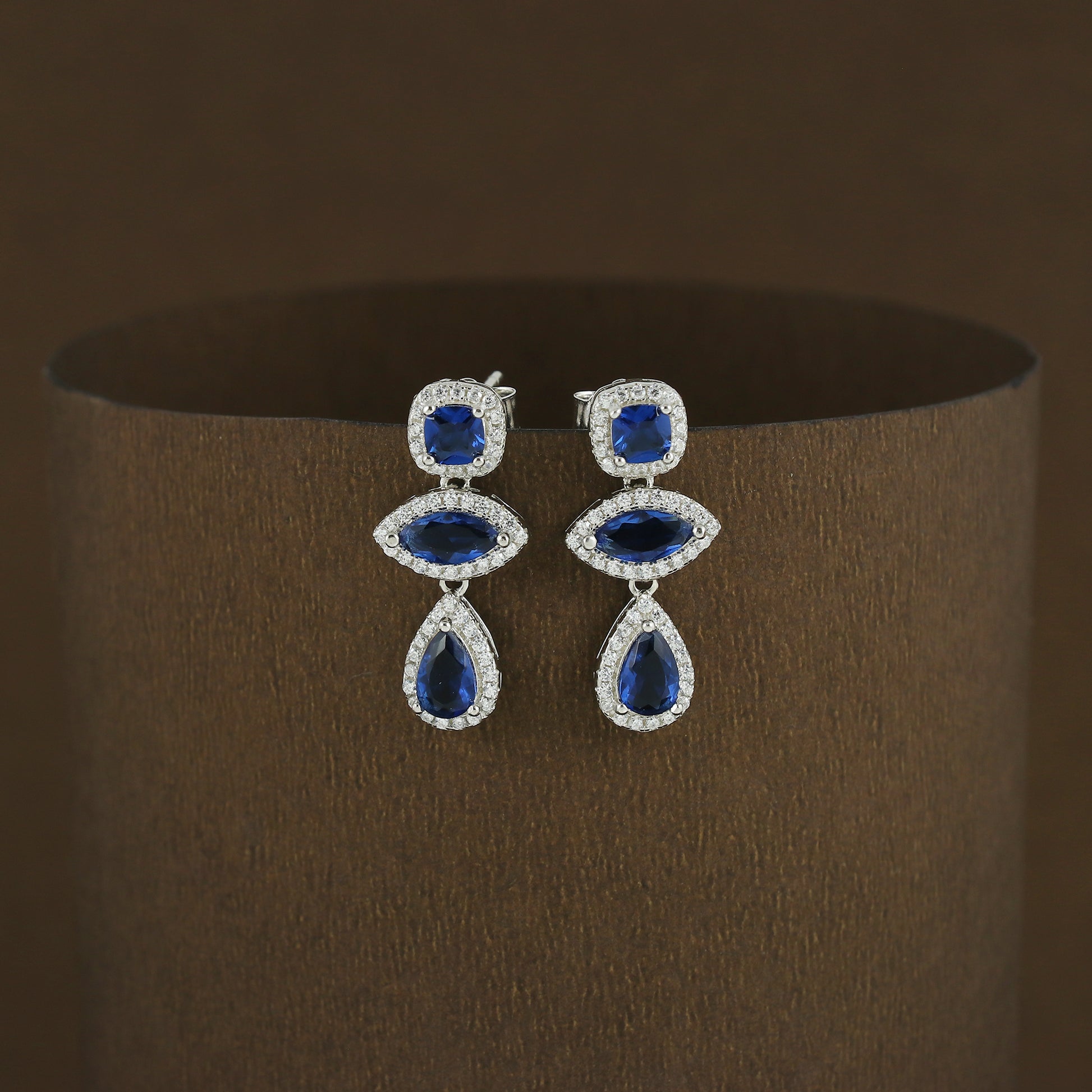 Elegent blue CZ drop earrings hallmarked in 925 pure silver in rhodium plating with AA+ Cubic Zirconia stones.