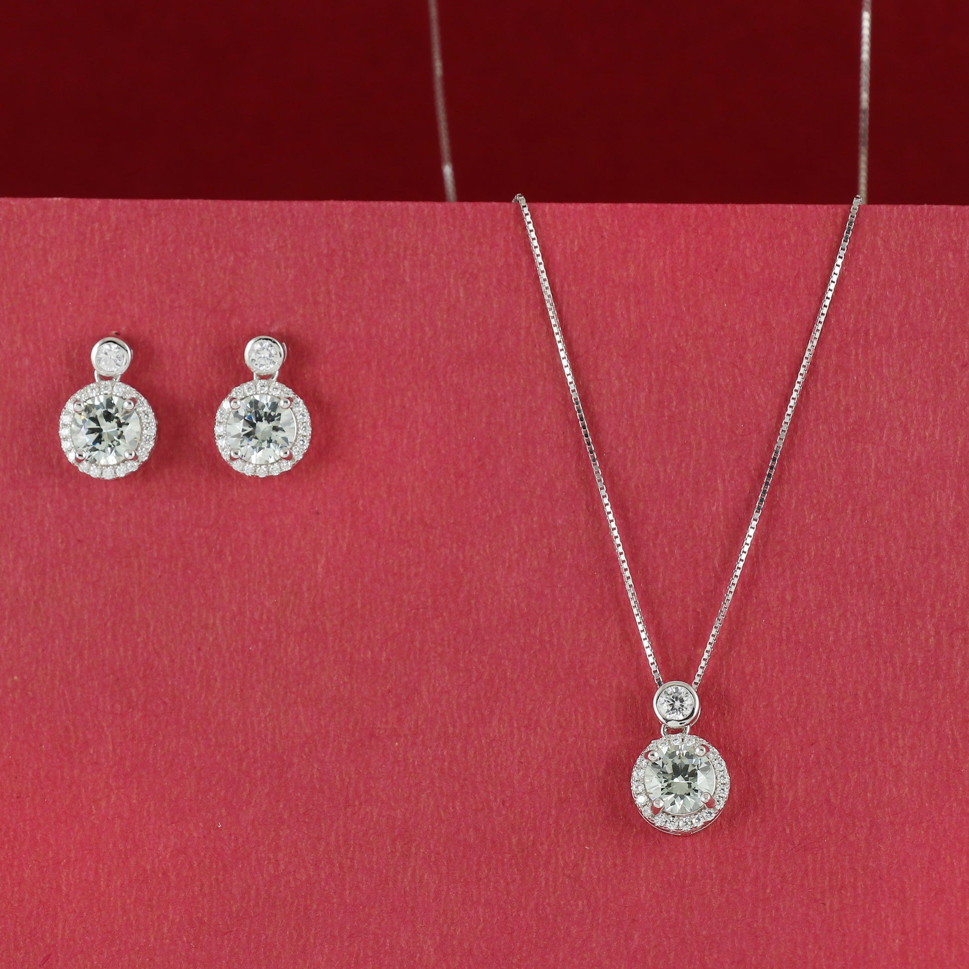 Green round CZ pendent set with earrings hallmarked in 925 pure silver in rhodium plating with AAA+ Cubic Zirconia stones.