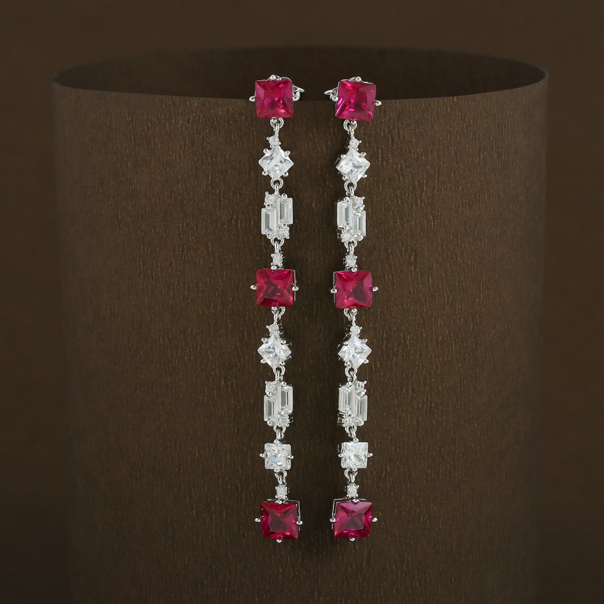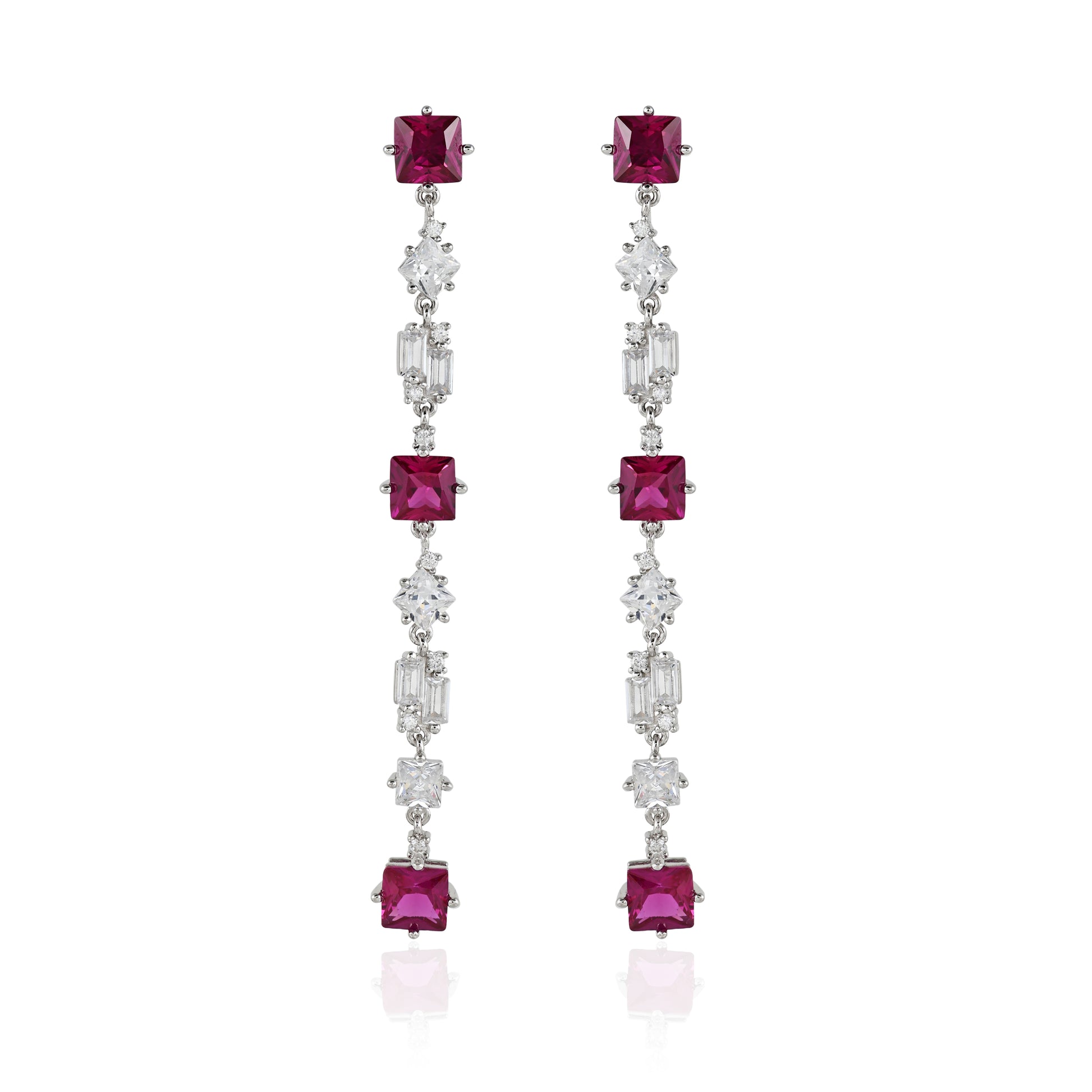Linear pink & white CZ diamond earrings hallmarked in 925 pure silver in rhodium plating with AA+ Cubic Zirconia stones.