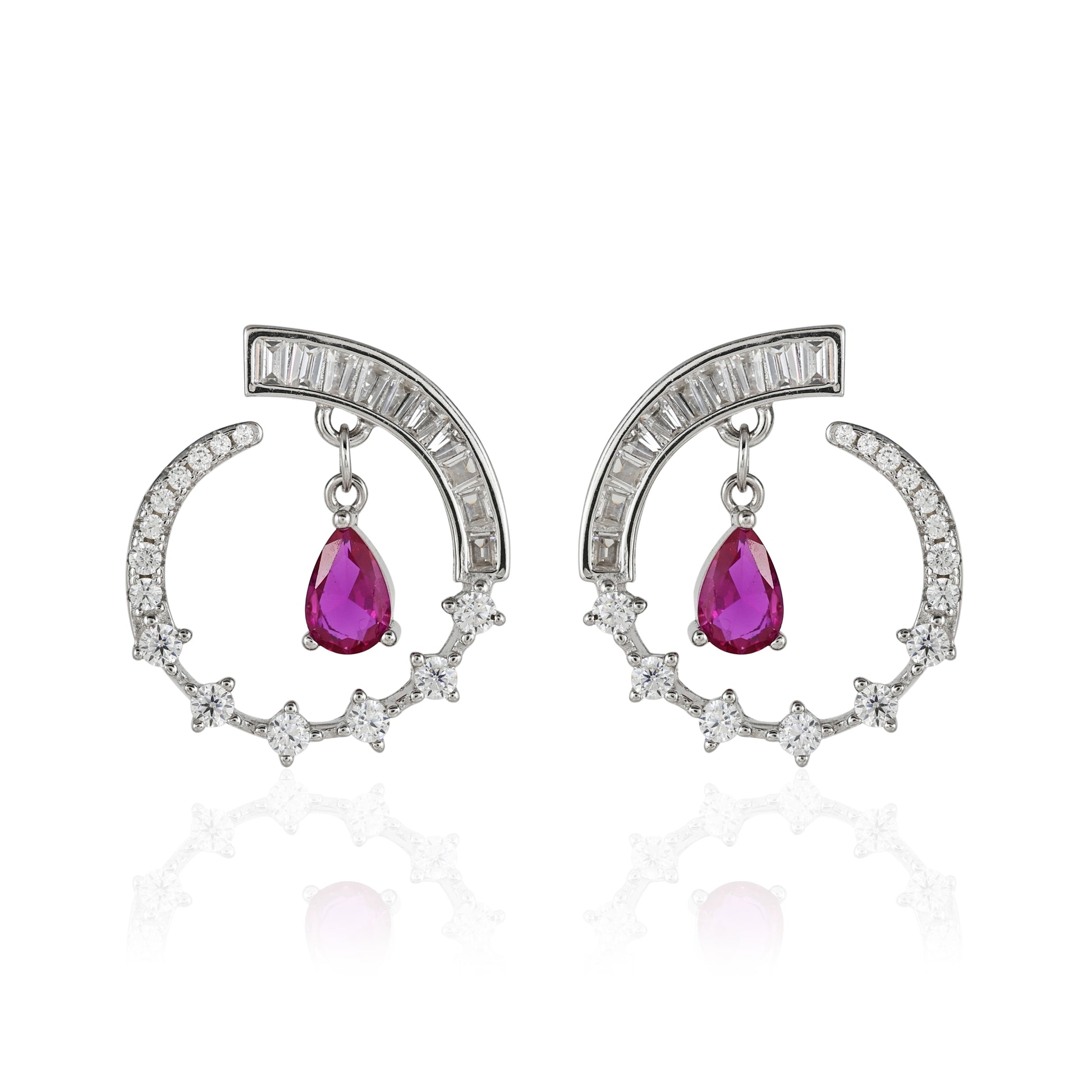 Ring pattern hanging stone earrings hallmarked in 925 pure silver in rhodium plating with AA+ Cubic Zirconia stones.