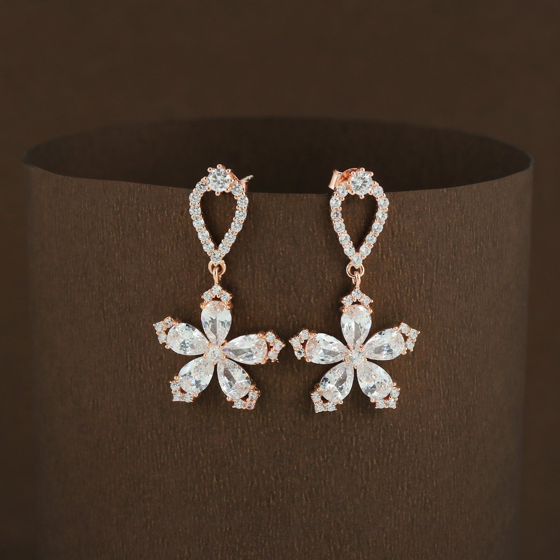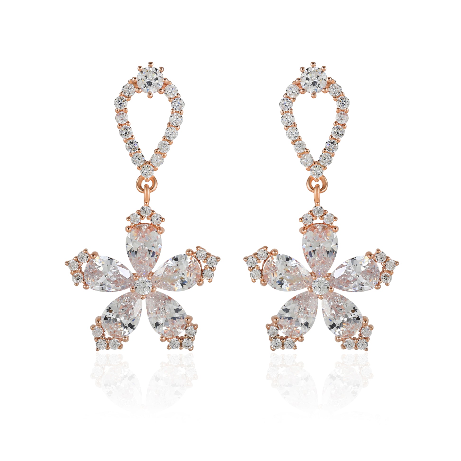 Rose gold CZ flower drop earrings hallmarked in 925 pure silver in rhodium plating with AA+ Cubic Zirconia stones.